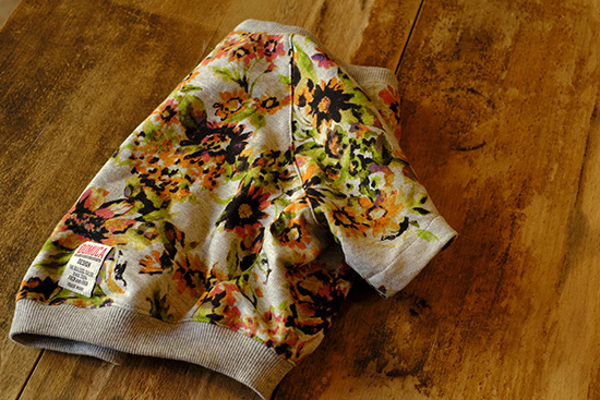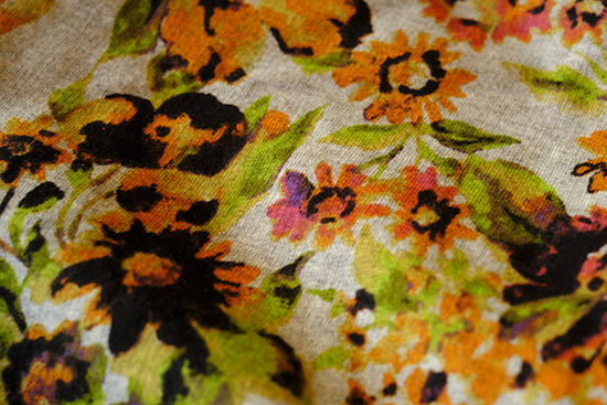 グレーベースにオレンジやグリーンの花柄模様が
