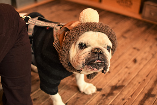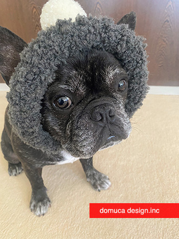 極太の糸でざっくりと編まれた犬用ニットキャップです。