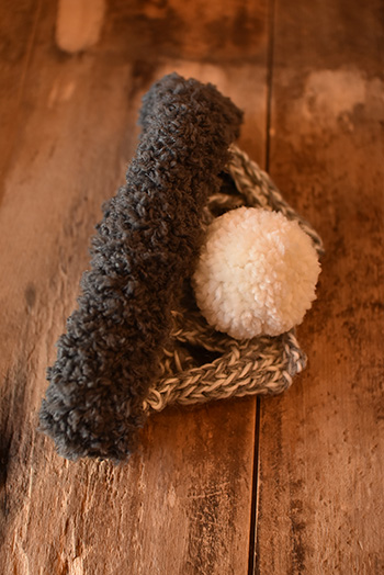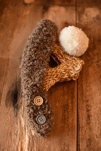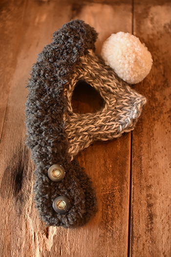 先にボタンを編み目に留めてから、頭に被せてあげると