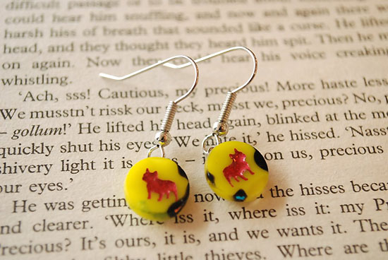 黄色の平らで丸いガラス玉にゴールドで「サンドブラスト(削り出し)」されています。