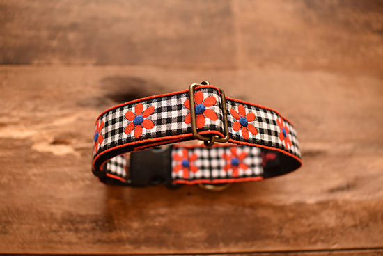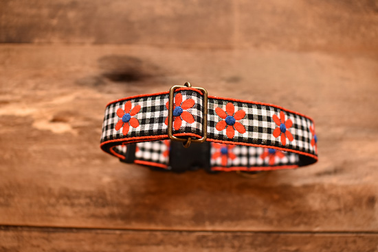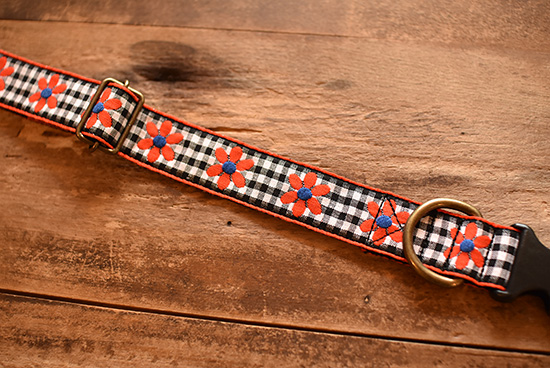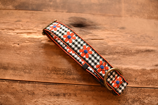 黒いギンガムチェック地に赤い花が刺繍されています。