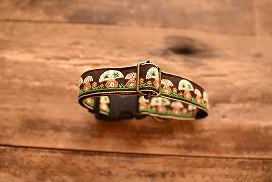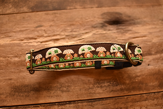 こげ茶をベースに大小のキノコが交互に刺しゅうされています。